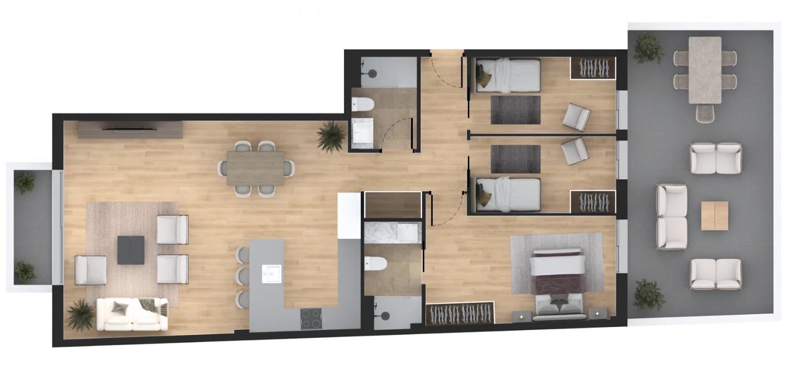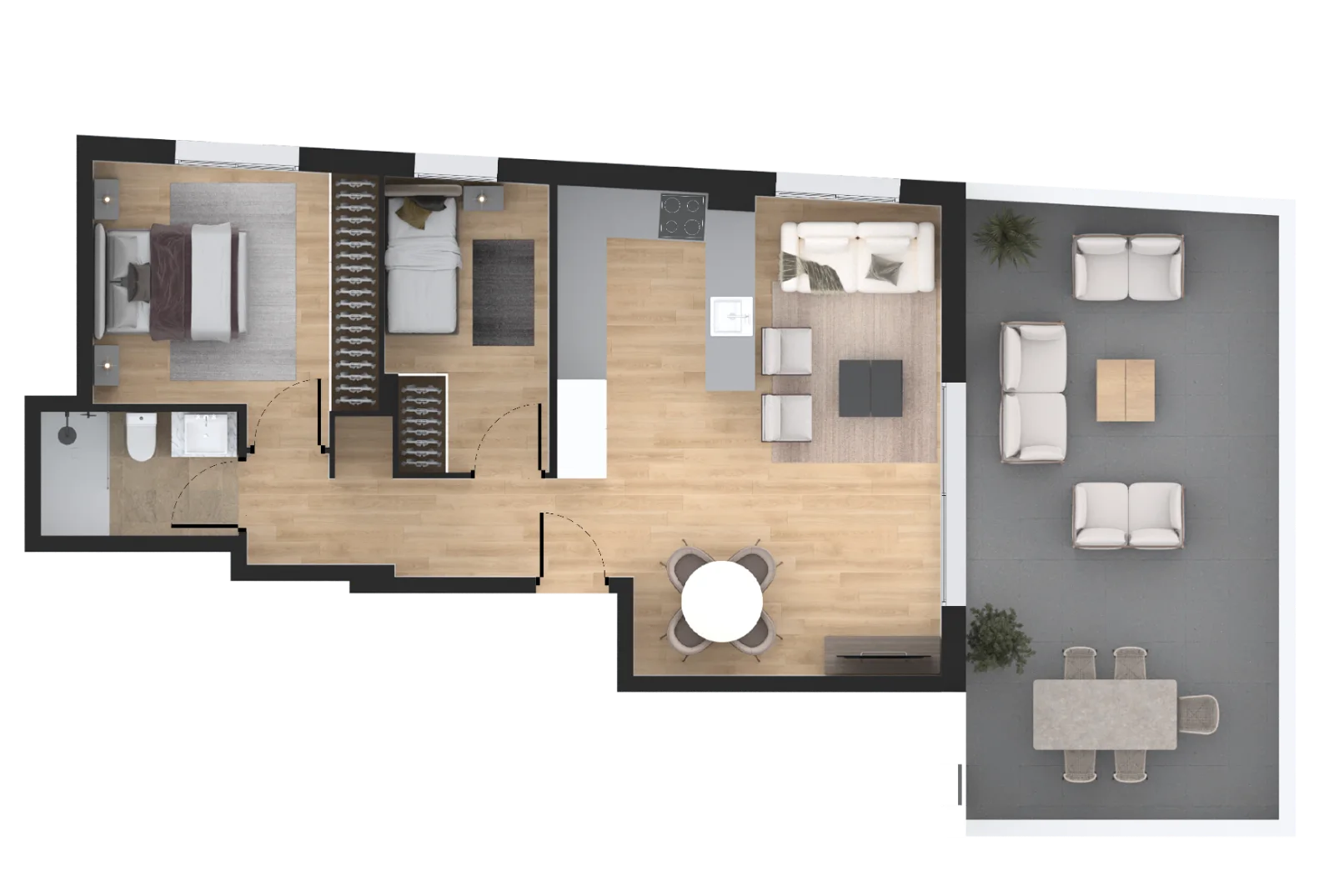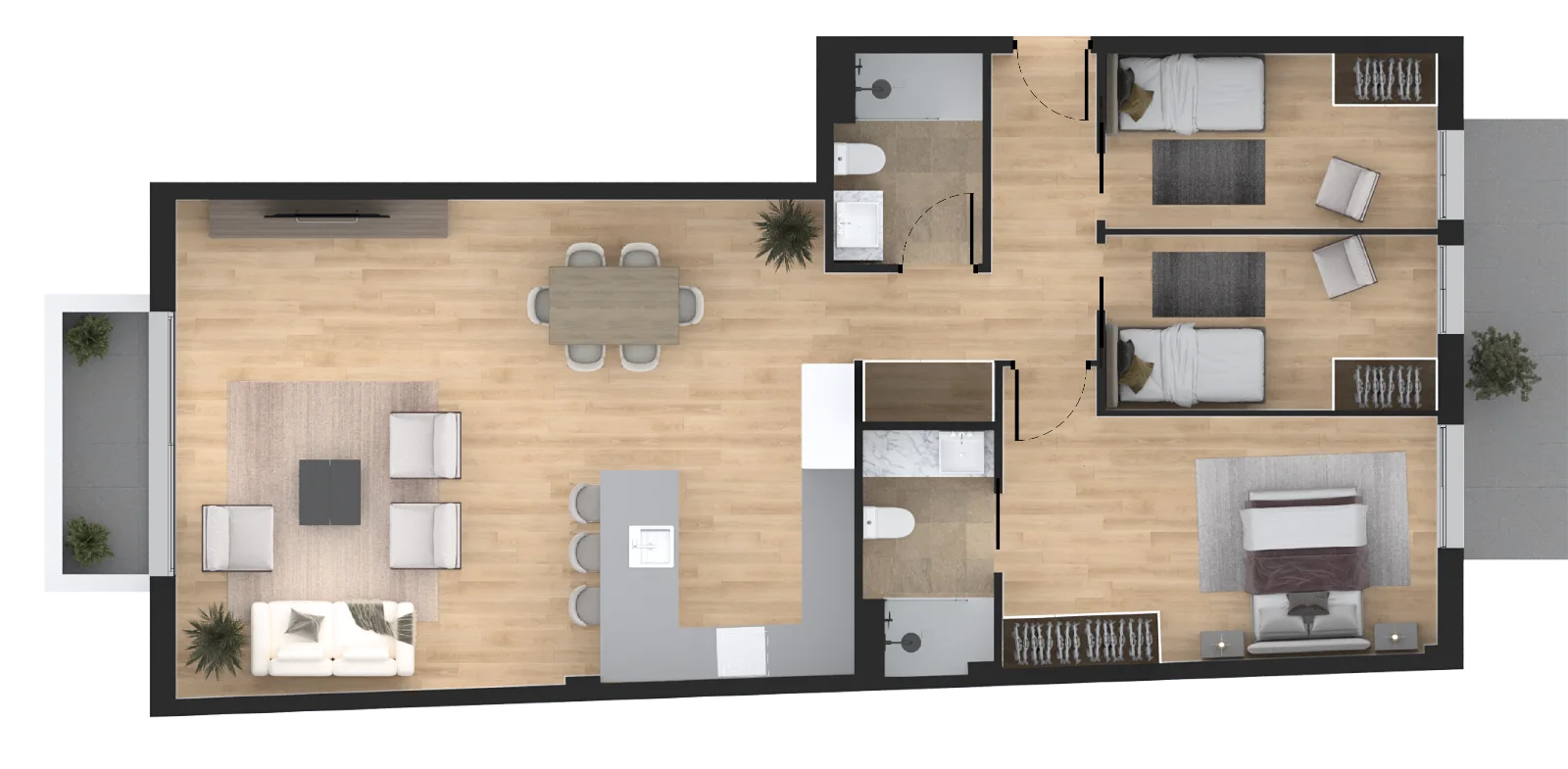 Aquesta informació està basada en el Projecte Bàsic i pot patir canvis per motius tècnics, legals o per ordre de l’administració, garantint sempre l’adequació al Projecte d’Execució. Les superfícies, la distribució de sanitaris i el sentit d’obertura de les portes són aproximats. El mobiliari i la decoració que apareixen a les imatges tenen una funció purament comercial i no formen part de l’oferta contractual.